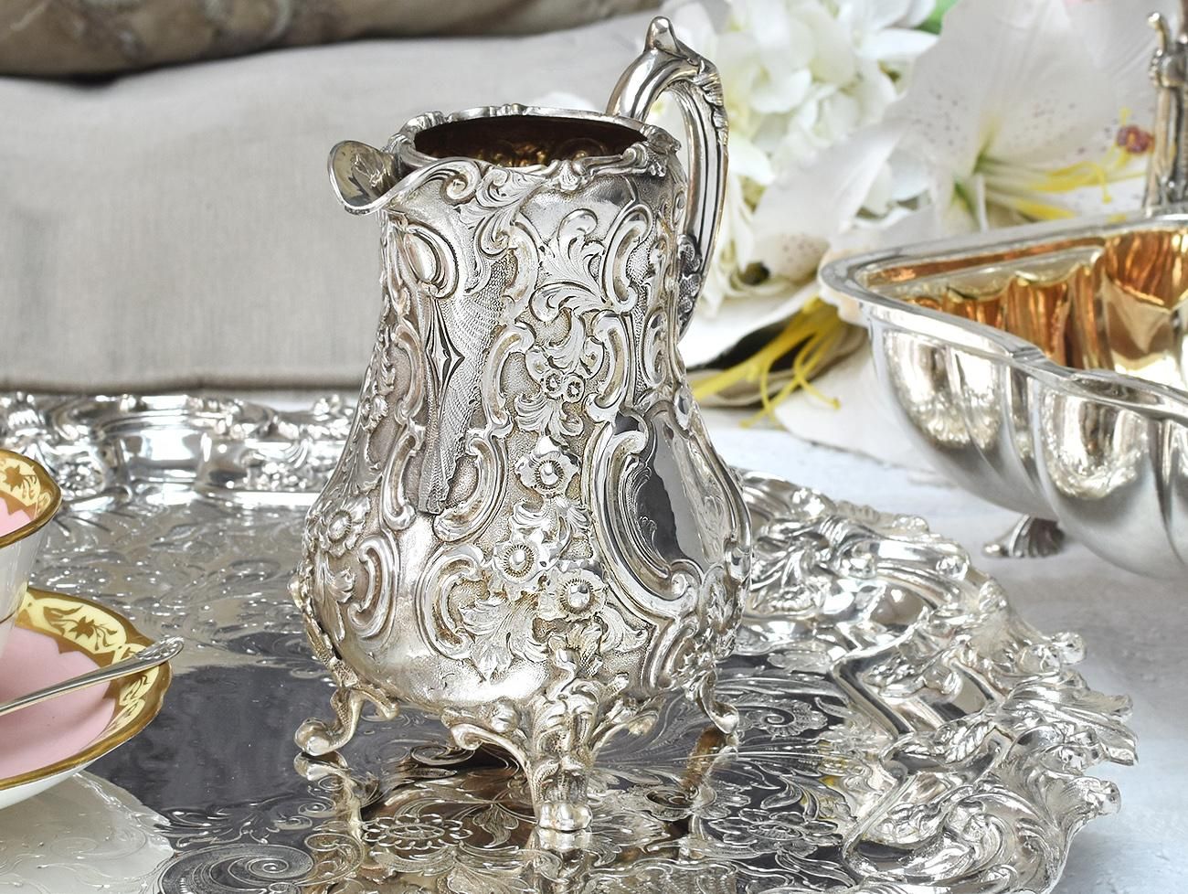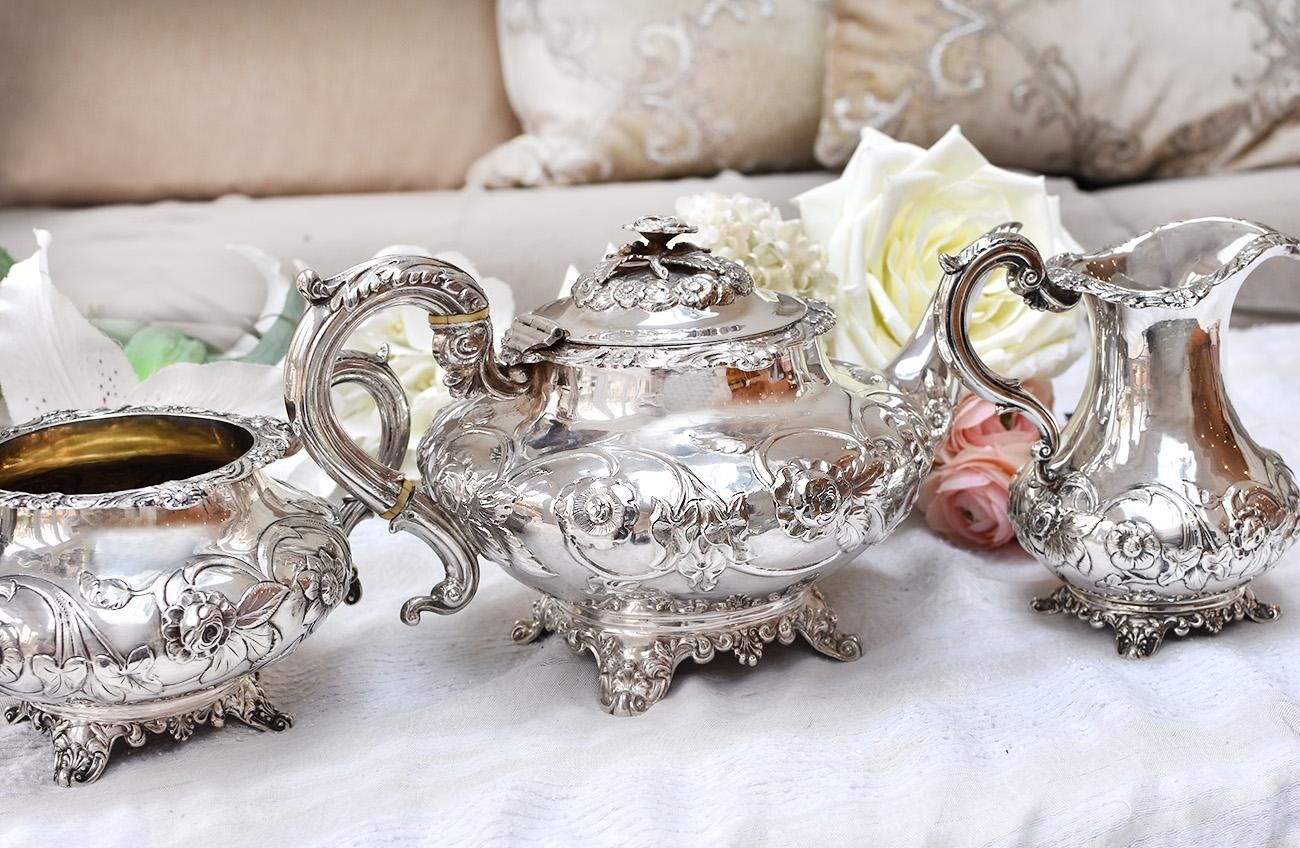 英国アンティーク銀器【純銀】1838年 お花摘み ティーセット Henry Wilkinson&Co 1830g◆商品動画有り
