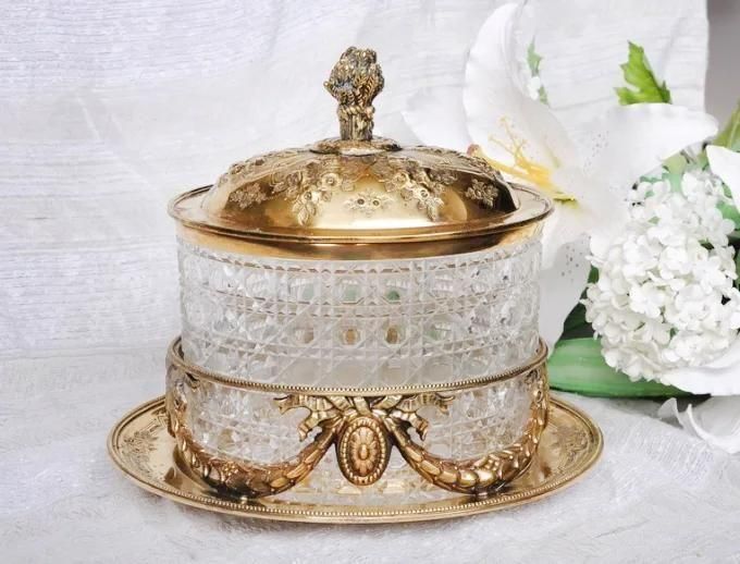 厚みのあるカットグラスに装飾的なフレームが重厚さを醸し出していて、とても雰囲気のある素敵なビスケットジャーです。