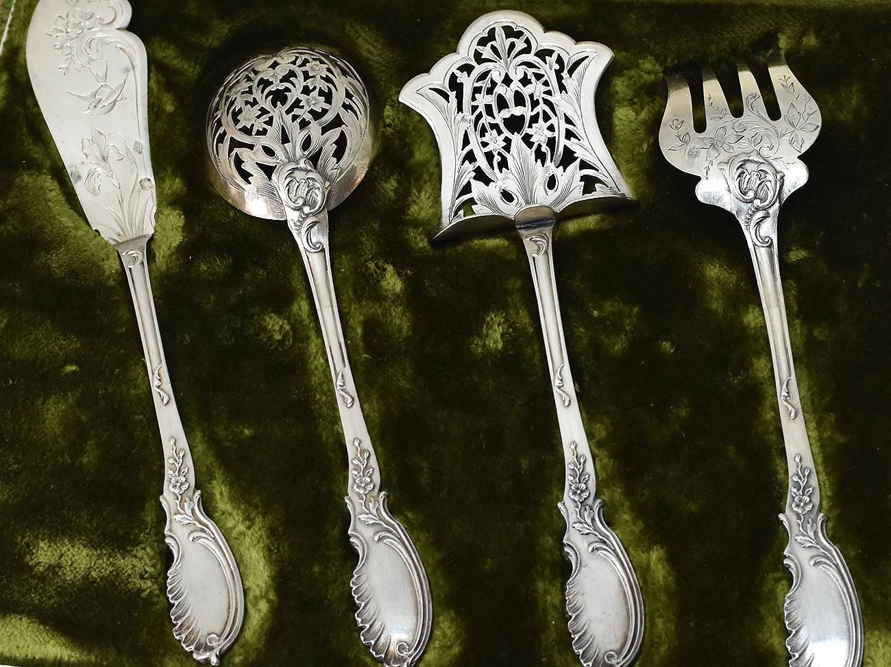 透かし細工や華やかな彫りをあしらった装飾に凝った小型のサービングセットというのはフレンチシルバーのお得意とするアイテムだと思います。
