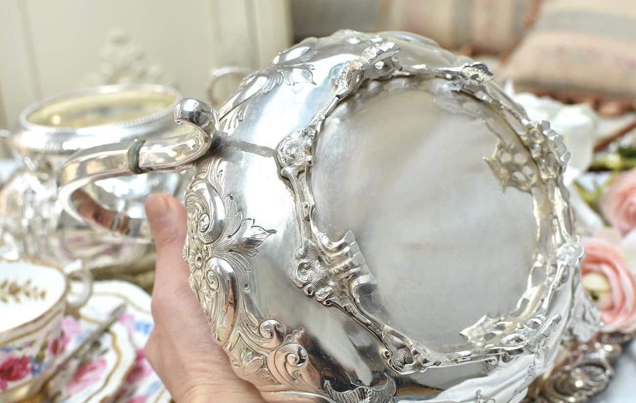 こちらのティーセットはシルバープレート製で、特徴的なメーカーズマークは刻印されておらず製造年代は不明です。