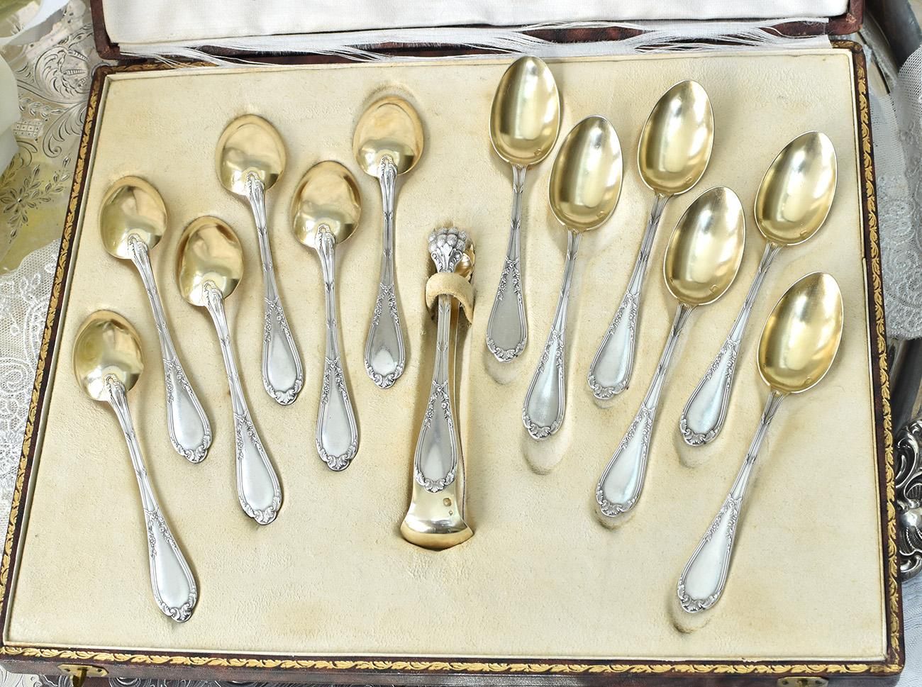 ヴェルメイユが美しく残る、ハンドルの小花のデザインなどに繊細で可憐な雰囲気が宿るティースプーンと、お揃いのデザインのシュガートングがセットになっています。