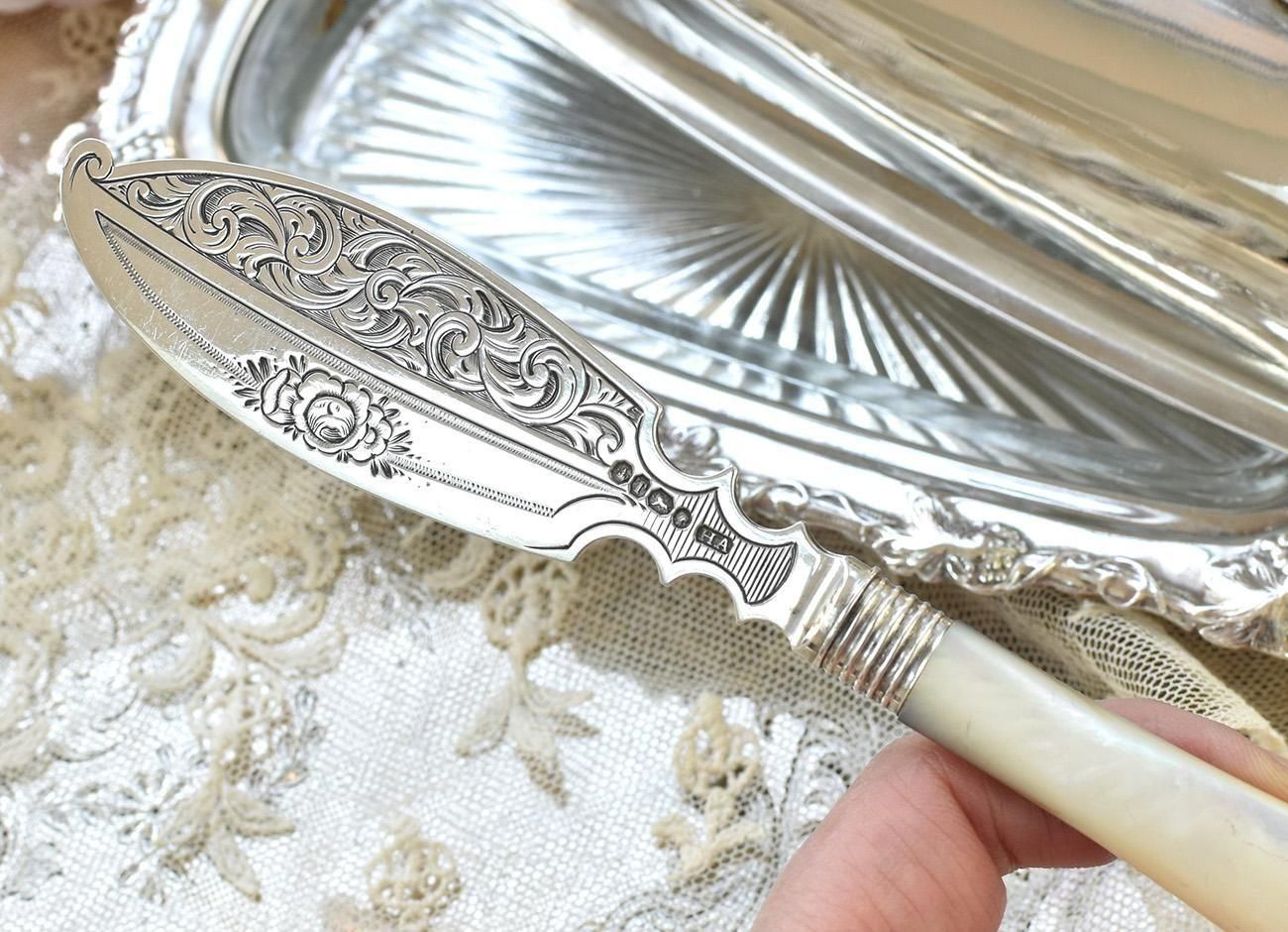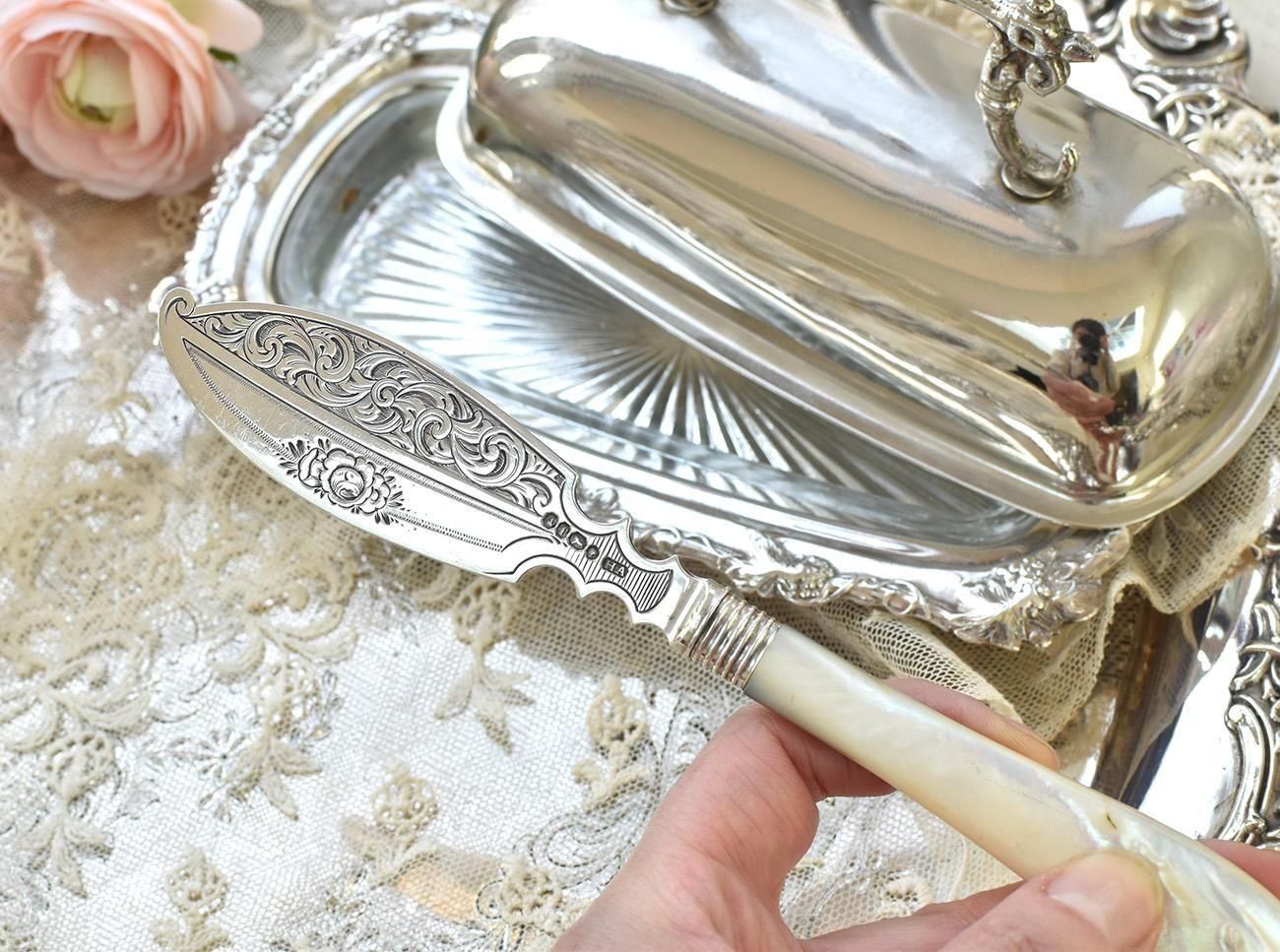 英国アンティーク【純銀】1861年 白蝶貝バターナイフ Atkin Brothers