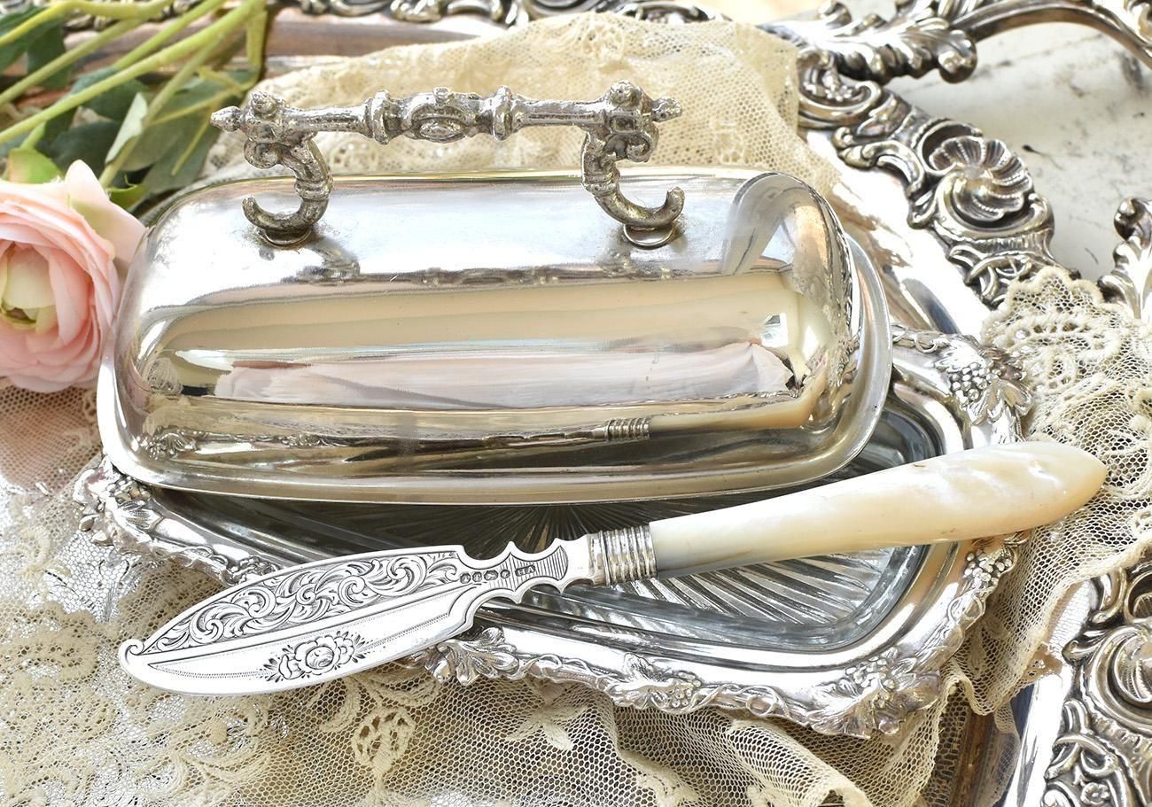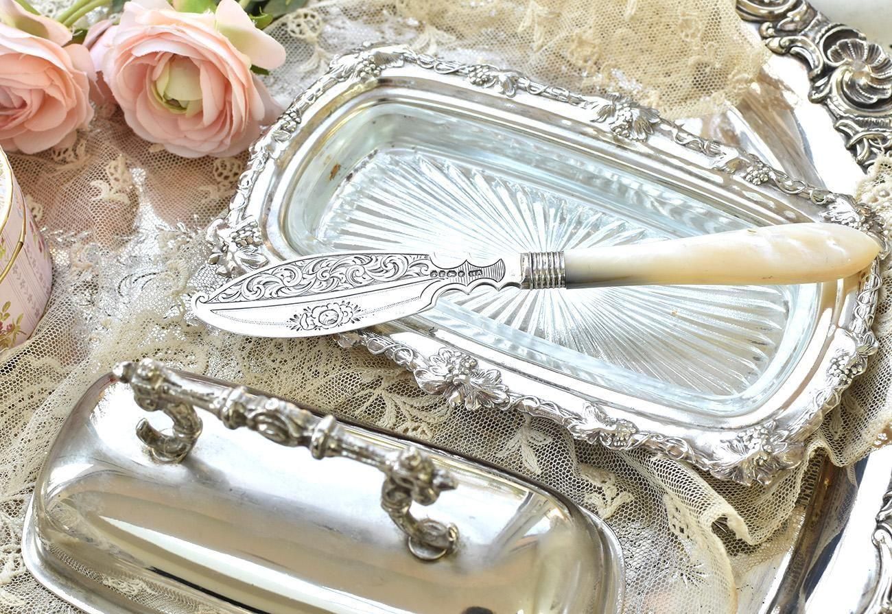 英国アンティーク銀器、白蝶貝ハンドルのバターナイフのご紹介です。