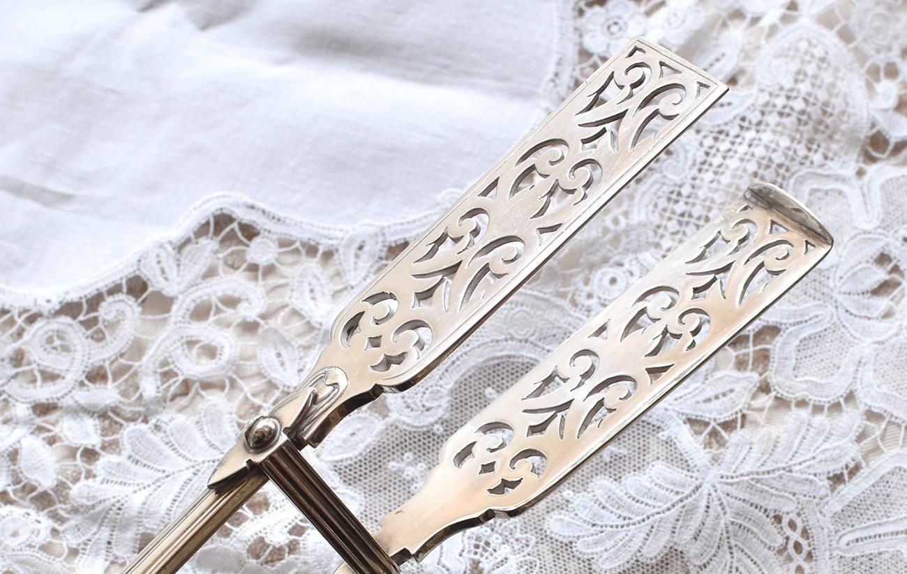 こちらのお品は英国アンティーク シルバープレート製のお品で、トング内側にはElkington&Coのマークと、Elkington独自のデートレターが入っており1866年に作られたお品である事がわかります(同じくマークがDの1889年と迷いましたが、E&Coのマークに王冠あるなしで早い方のDateであるだろうと判断しました)
