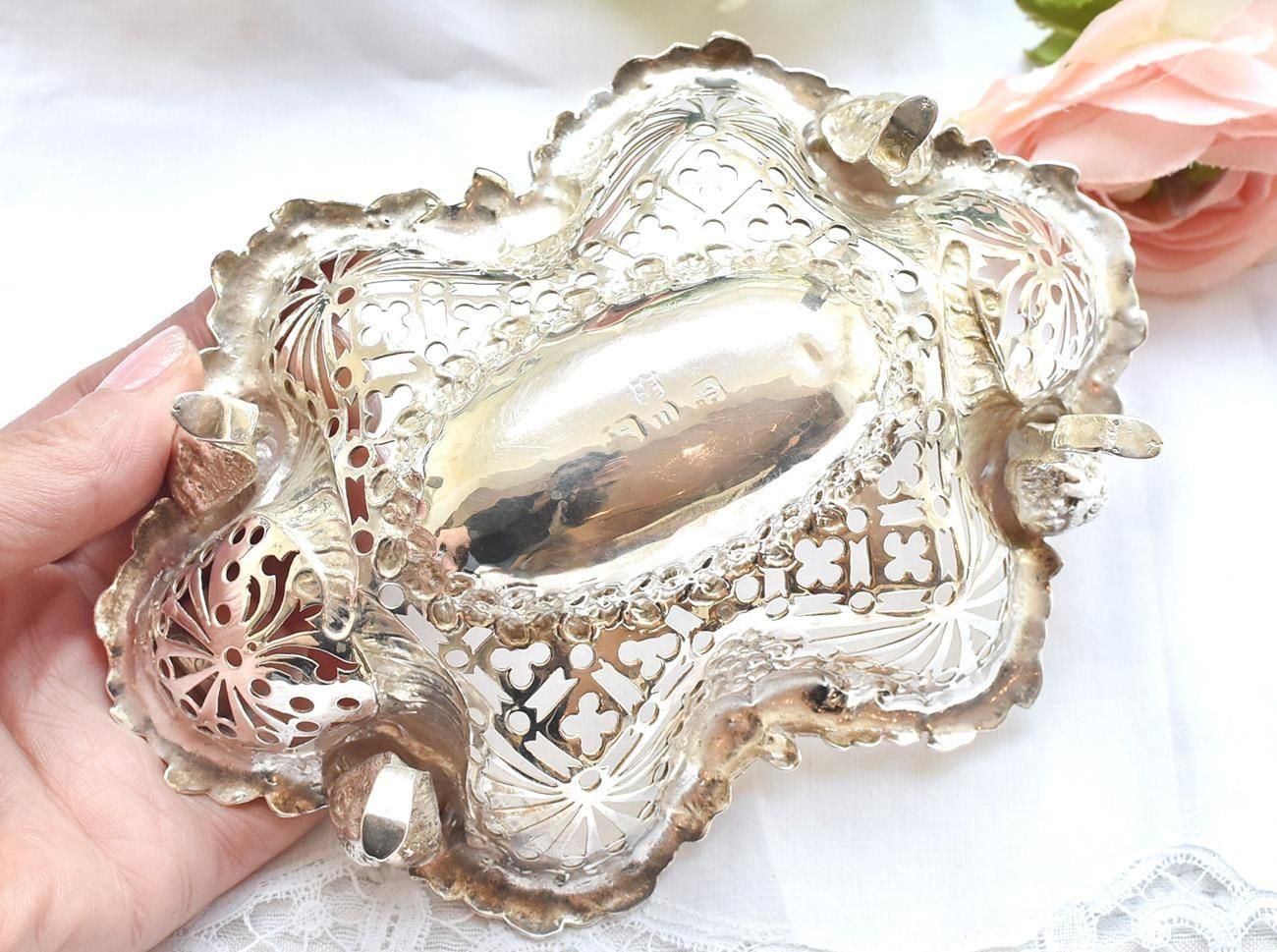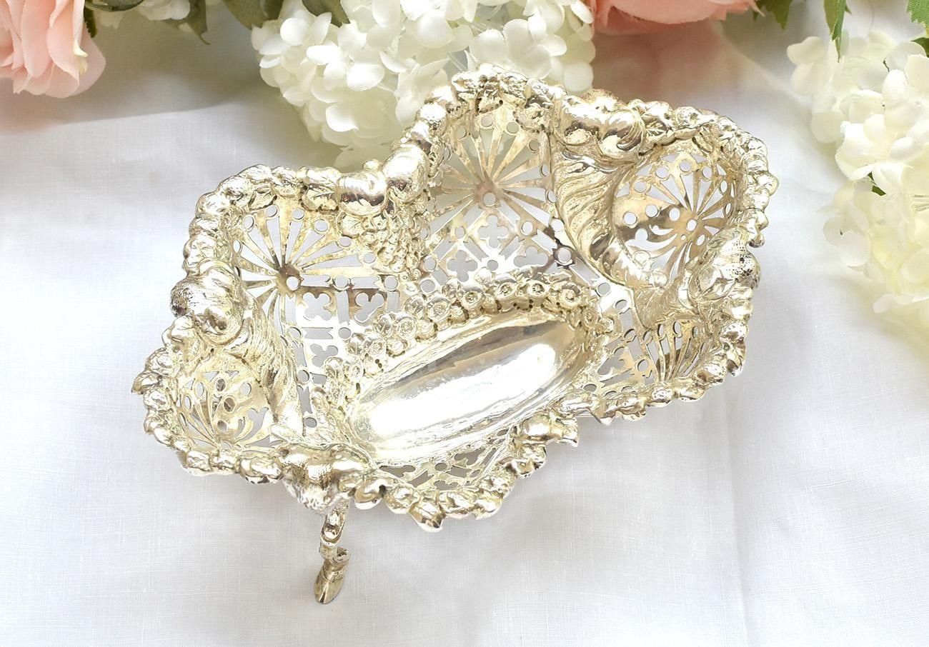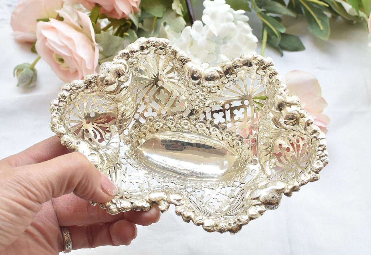 英国アンティークシルバー 純銀製のボンボンディッシュのご紹介です。