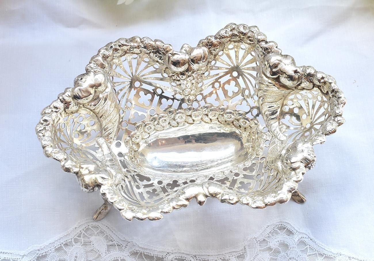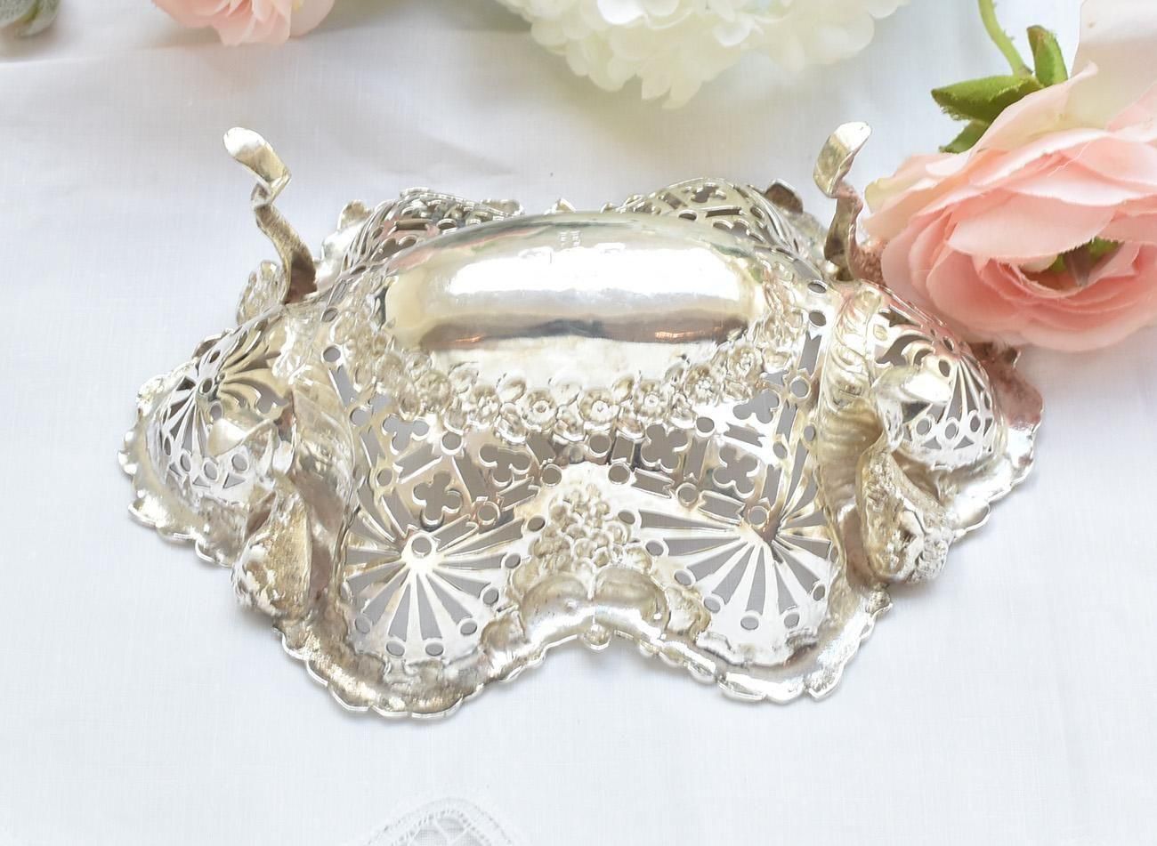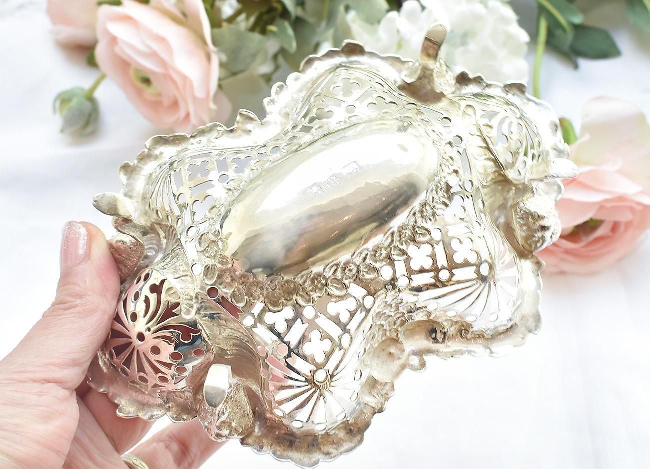 英国アンティークシルバー 純銀製のボンボンディッシュのご紹介です。